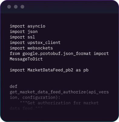 Upstox APIs help you connect your custom strategy or platform of your choice to your Upstox trading account. This helps you get the best of Upstox execution speeds with your own algorithm.